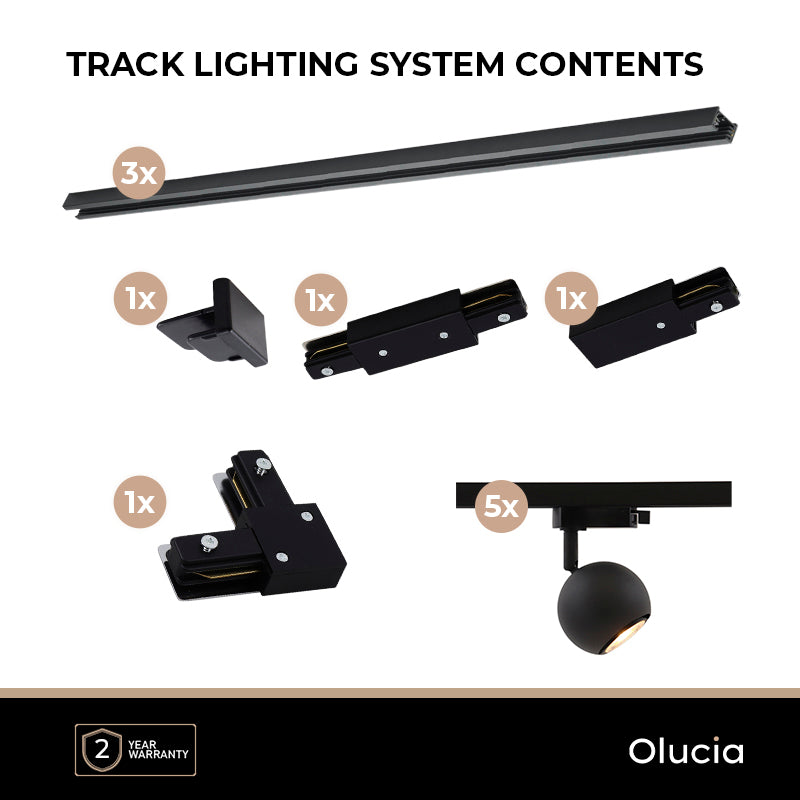 This set includes 3 meters of rail, a connector, a connection part, a corner piece an end cap and 5x spot light ALCO (light sources not included).